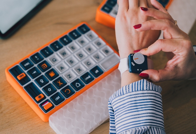Conçu par la designer italienne Alessandra Galli (TU Delft), OnCue associe un clavier compact à des bracelets connectés en Bluetooth. À chaque touche, une vibration guide le mouvement. Si une touche est maintenue trop longtemps, l’intensité augmente pour inviter à poursuivre la saisie. L’intelligence artificielle anticipe les lettres probables et les met en surbrillance, réduisant l’hésitation et les erreurs. L’autonomie atteint une semaine et l’ergonomie est personnalisable.