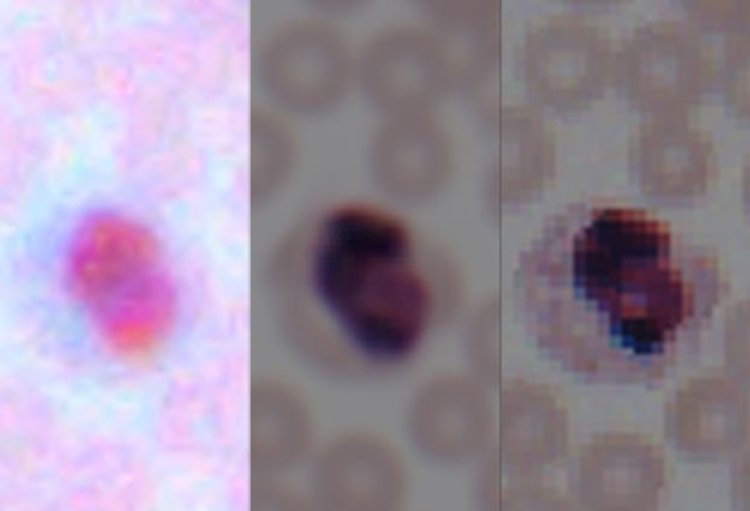 Image of a blood smear from a cell phone camera (left), following enhancement by the algorithm (center), and taken by a lab microscope (right). Credit: .Ozcan Research Group/UCLA
