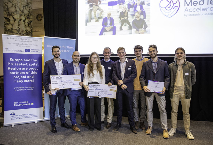 AETECH - "Adaptive ECMO to Enhance Cardiac Healing" : porté par Chloé Goemans (ingénieure biomédicale), Nicolas Baeyens (responsable du laboratoire de physiologie et pharmacologie de l’ULB) et Frédéric Vanden Eynden (chef du service de chirurgie cardiaque de l'Hôpital Erasme) : « L'ECMO est une assistance cardiaque et respiratoire externe qui maintient en vie les patients souffrant d'une pathologie cardiaque grave. En contournant le cœur, elle peut compromettre le processus de guérison. Pour pallier ce problème, nous avons conçu une nouvelle ECMO qui s'ajuste aux besoins du patient, permettant ainsi au cœur de fonctionner et de se régénérer. De plus, elle facilite la récupération en optimisant le sevrage du patient. »