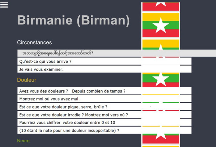 Très concret, ce site, qu’elle a codé elle-même, offre l’opportunité de traduire 50 phrases dans le cadre d'une consultation : il aborde huit thèmes de la prise en charge pour un médecin : les circonstances, la douleur, la neurologie, le respiratoire, le circulatoire, le malaise, le digestif, les antécédents. Tout le travail de traduction a été réalisé par des volontaires dont c'est la langue maternelle. Les questions et les réponses ont été fournies par des médecins qui ont accepté de se mettre en situation pour répondre au mieux au patient.