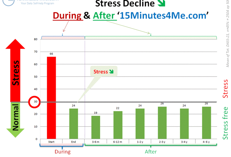 - persoonlijke subjectieve levensvoldoening stijgt met 40% na drie weken en blijft stabiel tijdens en na het programma