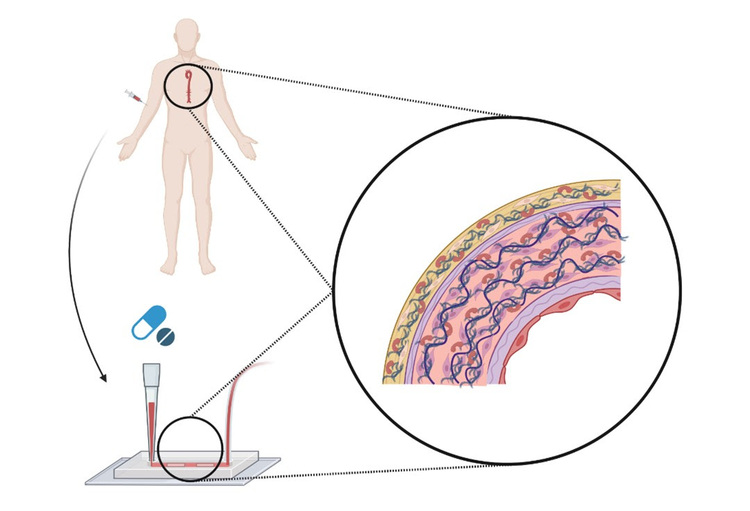Deze miniatuurversie bevestigen de onderzoekers vervolgens in een chip van amper enkele millimeters groot. Nog nooit werden al die verschillende lagen van een menselijke aorta in zo’n zogenoemde orgaanchip aangebracht. Het model van Verstraeten en haar team zal dus een wereldprimeur zijn. “Wanneer we dat plaatje in contact brengen met bloeddruk en -stroom, bootsen we eigenlijk de omstandigheden in een echte aorta na. Onze bevindingen van de muisstudies kunnen we zo rechtstreeks uitproberen op onze miniversie van patiënten.”